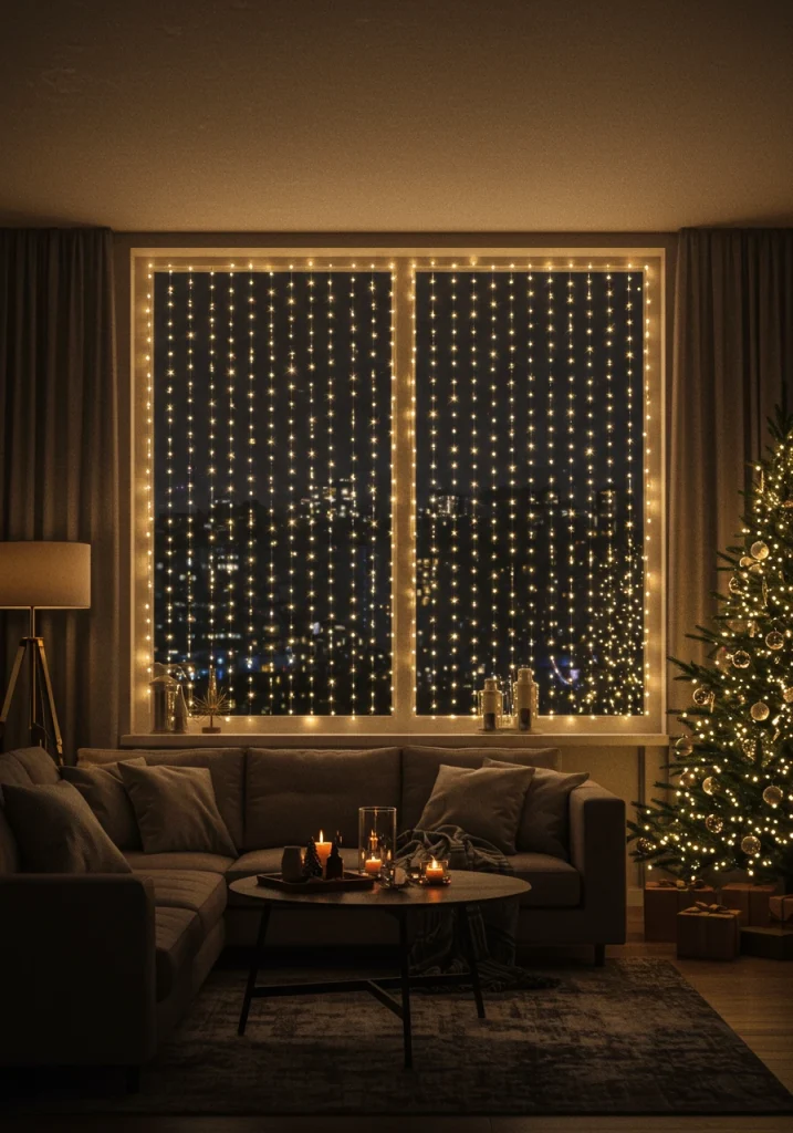 For a truly high-impact, dramatic, and magical window display, hang a set of curtain or “waterfall” lights. These are a series of long, vertical light strands that are all connected to a single, horizontal top strand, designed to be hung like a curtain of light. When hung inside a large picture window, they can create a stunning, floor-to-ceiling, wall of sparkling light.