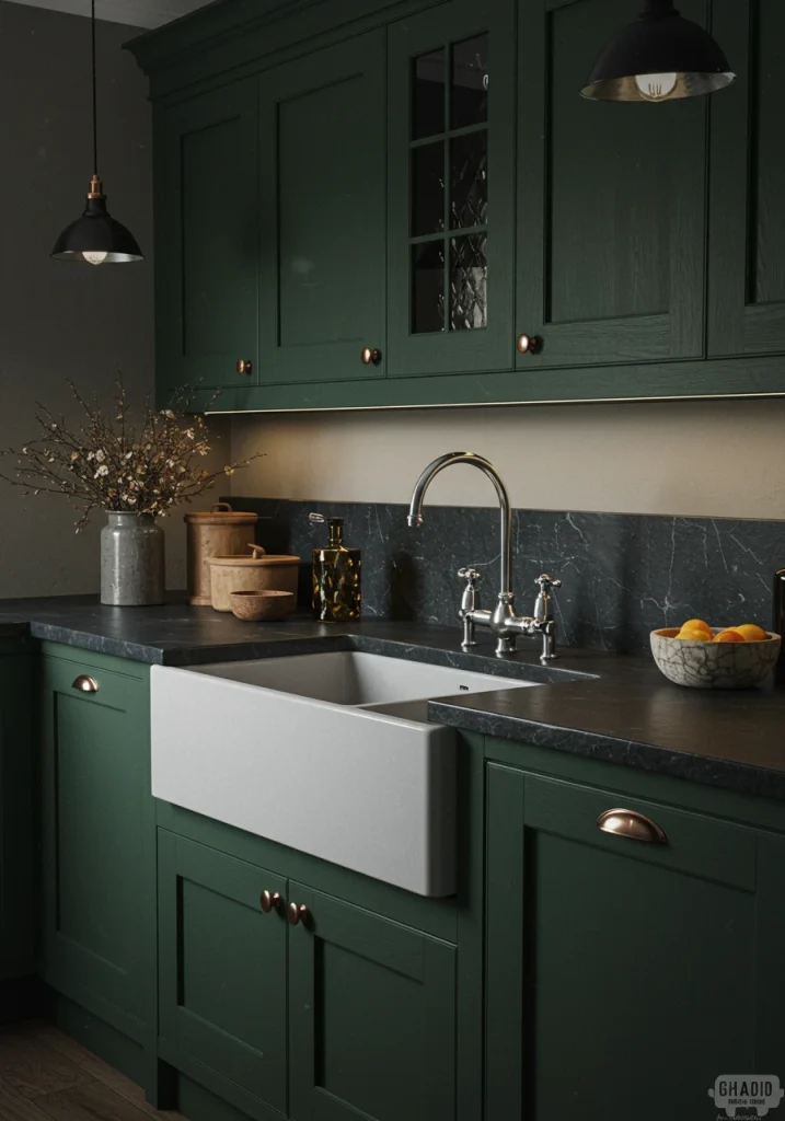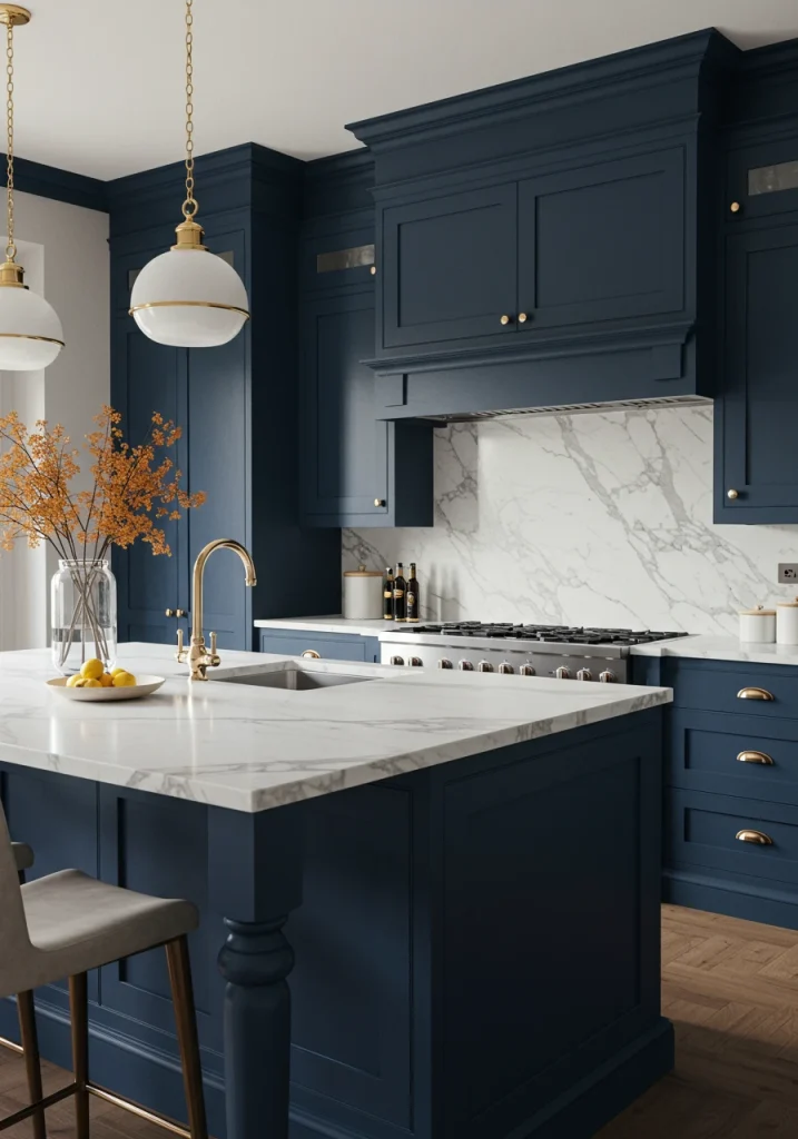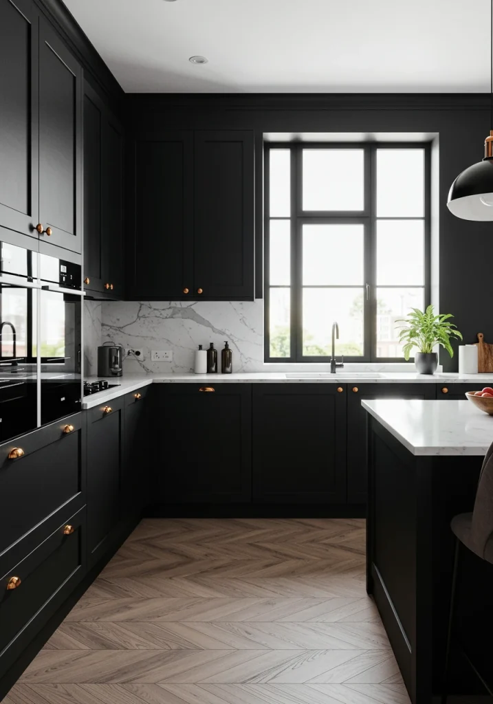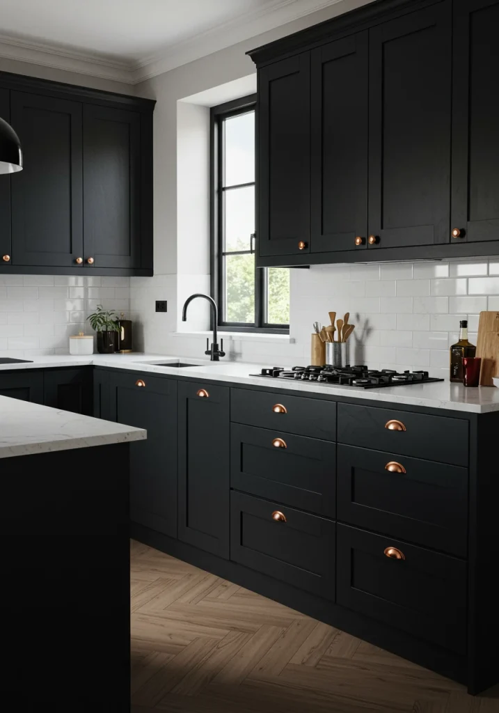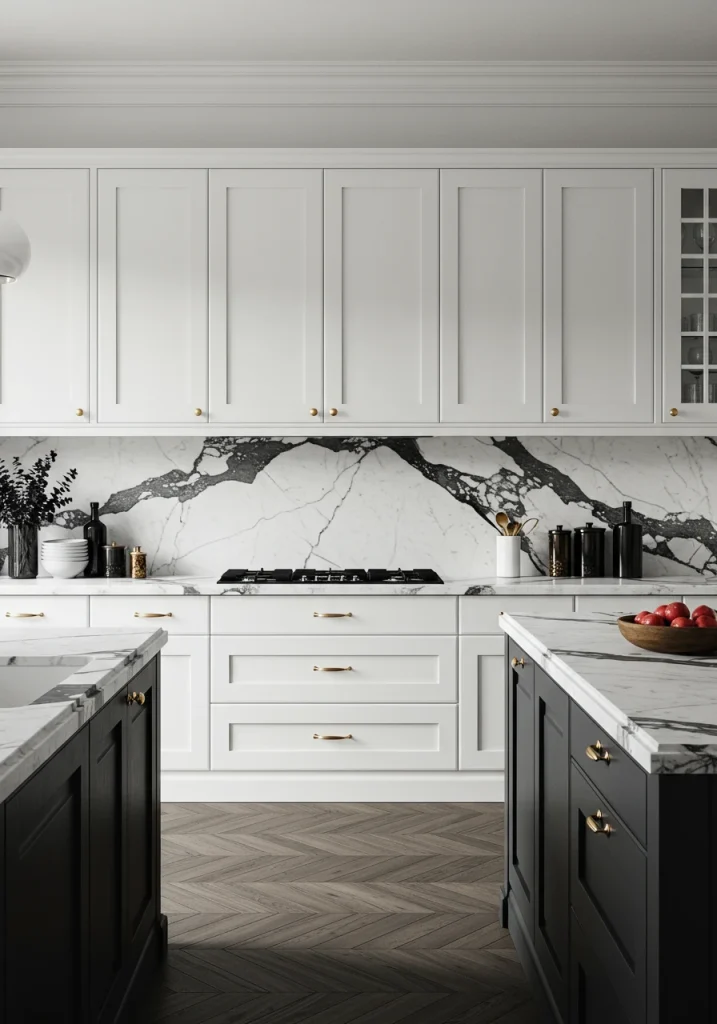 • Dark Cabinets, Light Counters: This is the most popular combination. Deep black, navy blue, or charcoal gray cabinets paired with a crisp, white quartz or a light, veined marble countertop, as seen in your reference photos, is a stunning look.