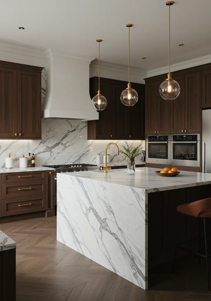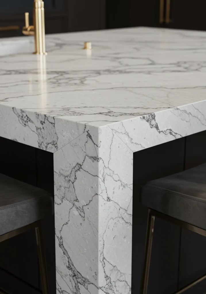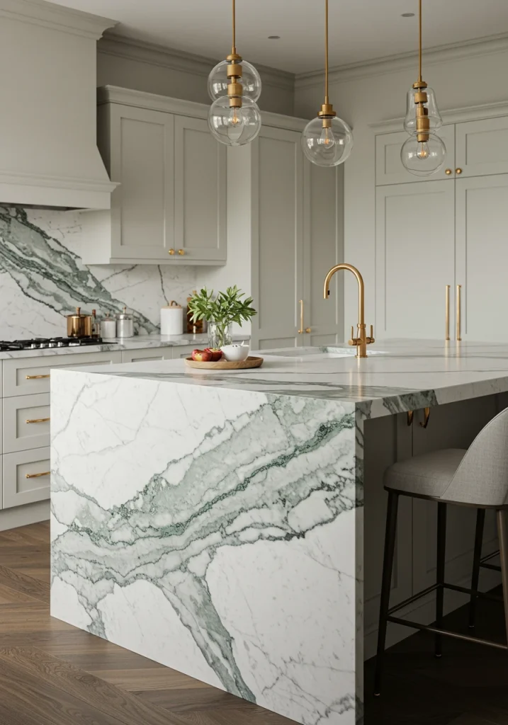 For the ultimate, show-stopping enhancement, use a “book-matched” slab of a dramatically veined stone for your waterfall island. The symmetrical, mirrored pattern of the veining flowing down the sides of the island will be a true work of art.