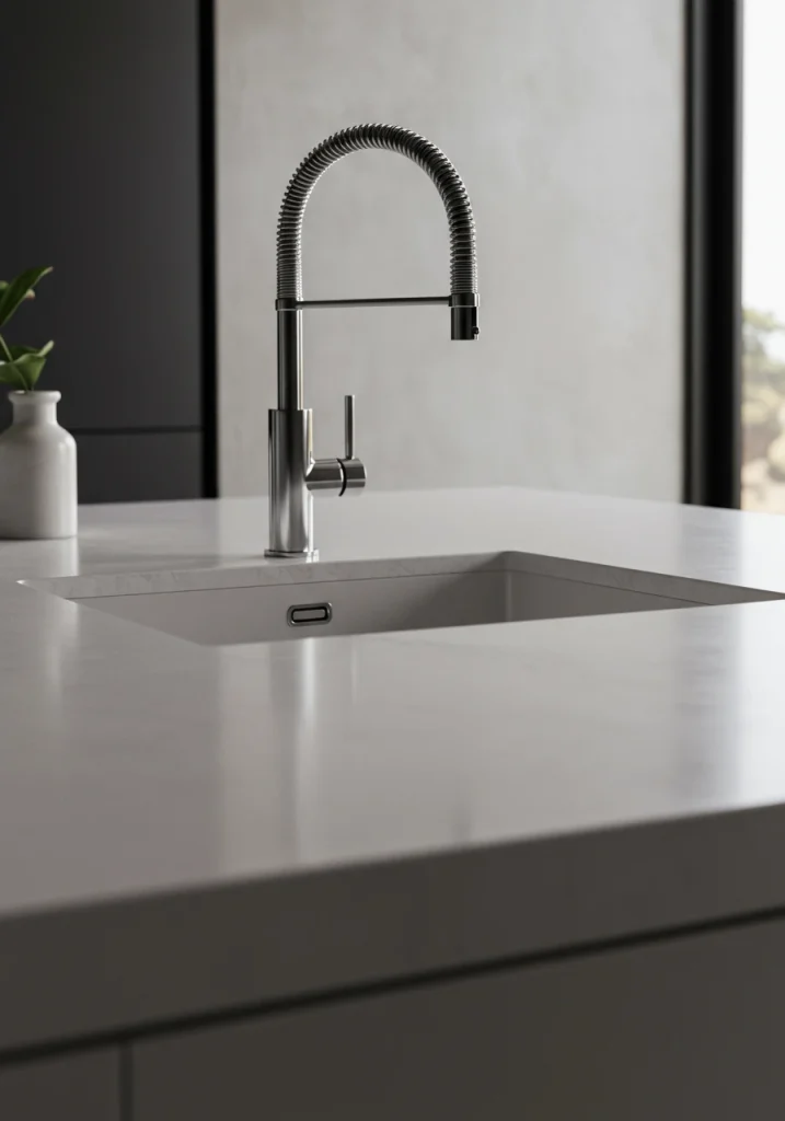 An integrated sink is a key feature of a modern, minimalist, and luxurious countertop design. An integrated sink is one that is made from the very same material as the countertop itself, creating a completely seamless, continuous surface with no visible seams or edges. The look is incredibly clean, sculptural, and high-end.