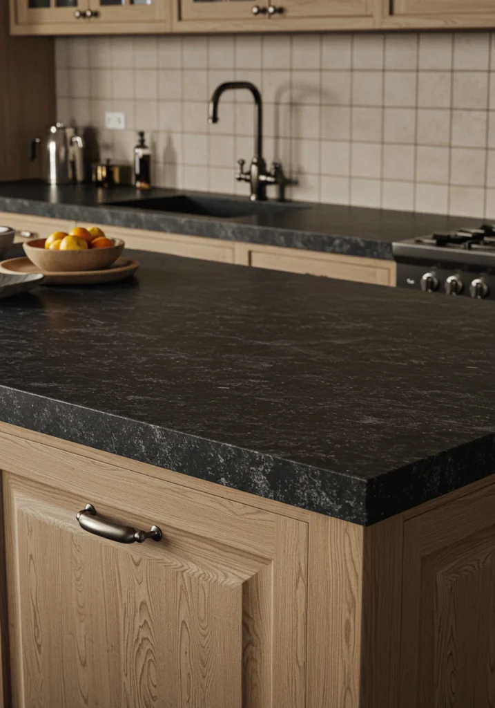 For a countertop that is dark, moody, and full of a soft, old-world character, soapstone is a beautiful and historic choice. Soapstone is a natural stone that is typically a deep, charcoal gray with a very soft, smooth, “soapy” feel. It often has subtle, beautiful, milky white veining. It’s a classic material that has been used in kitchens for centuries and is a hallmark of the modern farmhouse and traditional aesthetics.