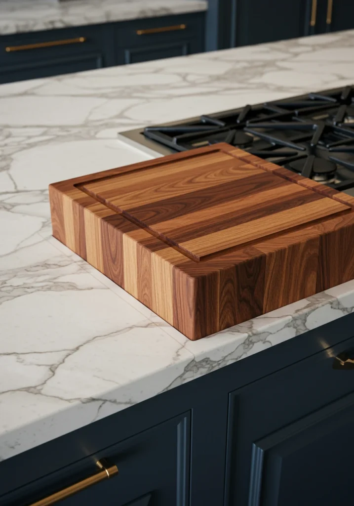 A truly innovative and luxurious detail for a kitchen countertop is a custom, integrated cutting board. This is a high-end, custom feature where a section of your countertop, usually right next to the stove, is made from a thick, beautiful, end-grain butcher block. It’s a seamless and incredibly functional feature that is perfect for a passionate home cook.