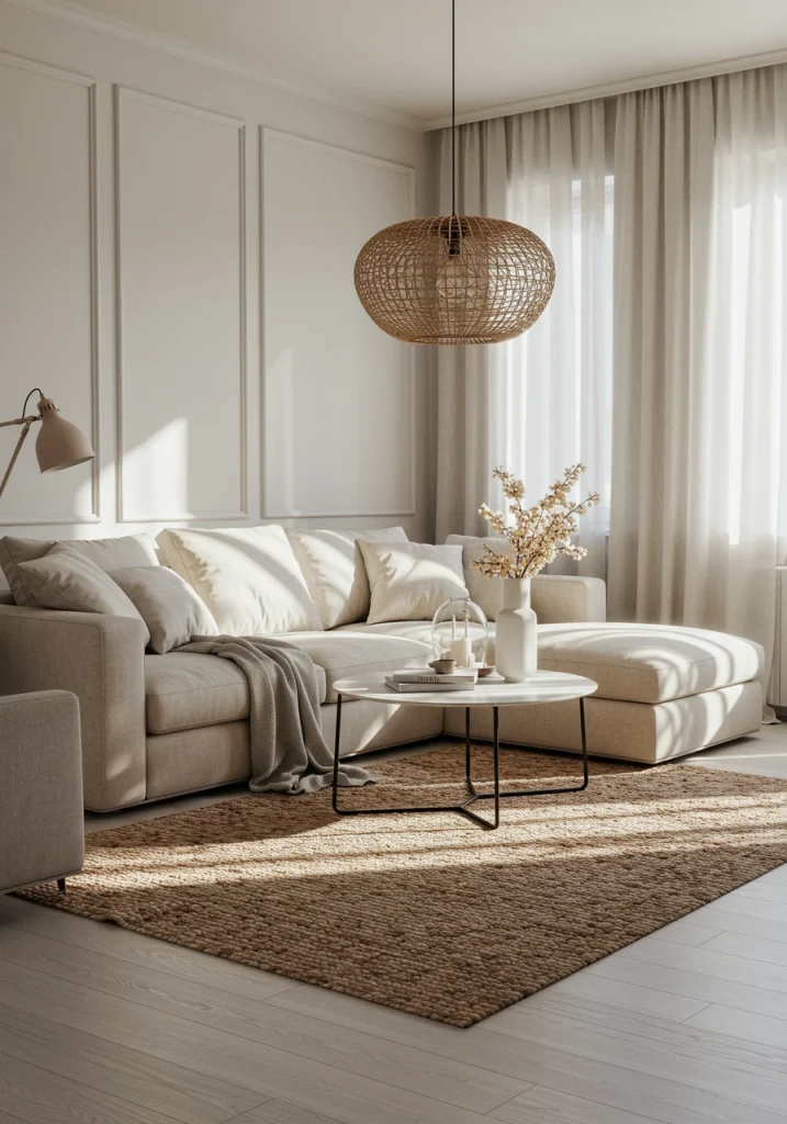 For an enhancement, create a rich, layered, “tone-on-tone” look. Pair your creamy white walls with a slightly deeper, beige-colored sofa, ivory-toned pillows, and a natural, jute area rug. The subtle variation in neutral tones is incredibly sophisticated.