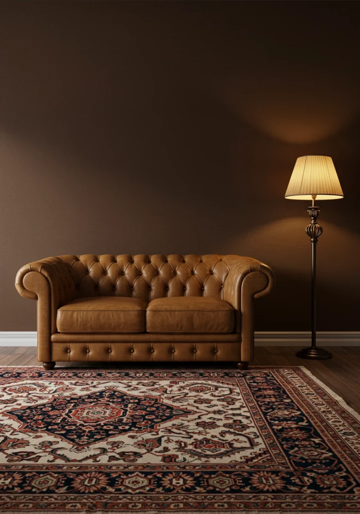 - Pairs With: Warm, walnut wood tones, rich, camel-colored leather or velvet, and brass accents.