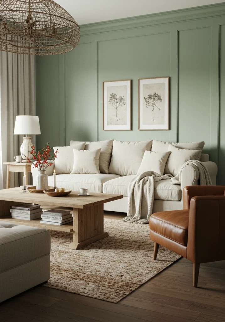 I love to use sage green on the walls for a look that is inspired by the outdoors. When paired with natural materials, the result is a living room that feels like a breath of fresh air. This palette is a cornerstone of the modern farmhouse and organic modern aesthetics.