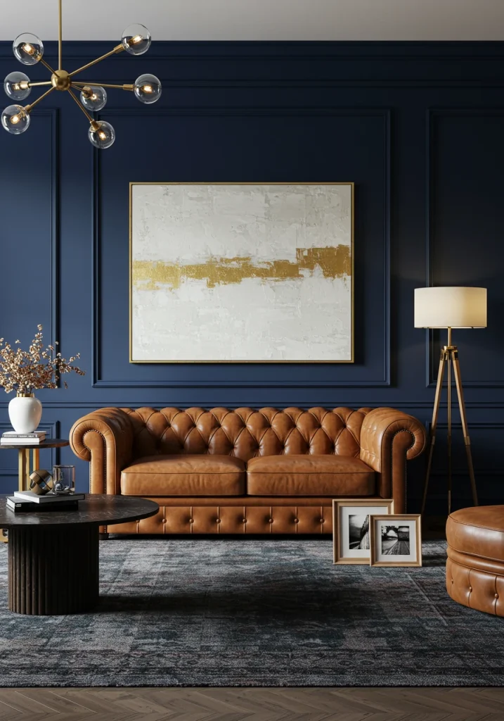 For a look that is classic, dramatic, and sophisticated, a deep navy blue is a stunning and timeless choice for a living room. Navy blue is a bold color, but it also functions as a sophisticated neutral, much like a classic navy blazer. It’s a color that is both grounding and deeply elegant, perfect for creating a cozy, den-like feel, especially in a library or a formal living room.