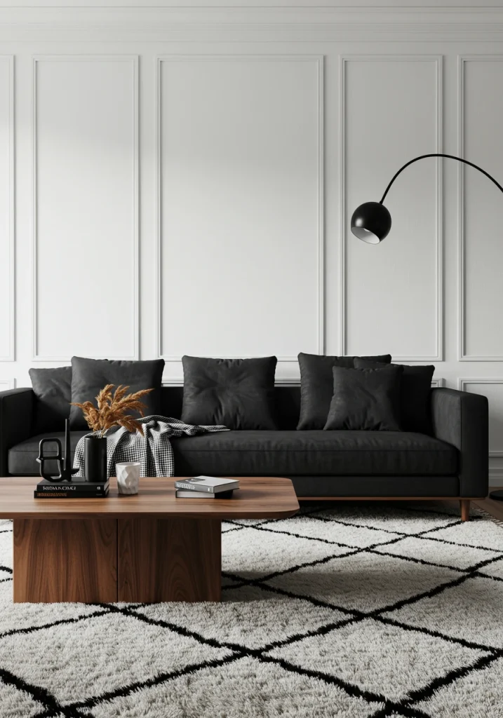 - Modern Approach: Crisp white walls with a bold, black sofa, black metal accents, and a graphic, black and white rug.
