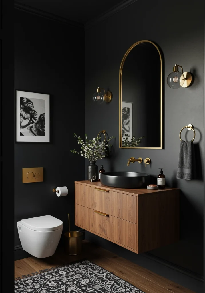 A black bathroom is the epitome of chic, and the current trend is all about a soft, chalky, matte black. Unlike a high-gloss black which can feel a bit harsh and show every imperfection, a matte or chalky finish absorbs light, creating a velvety, soft, and incredibly sophisticated surface. It’s a bold choice that can make a powder room feel like an intimate jewel box or a larger master bathroom feel dramatic and luxurious.