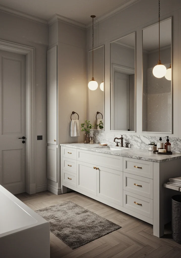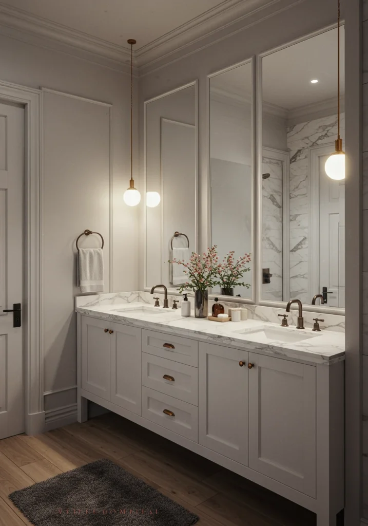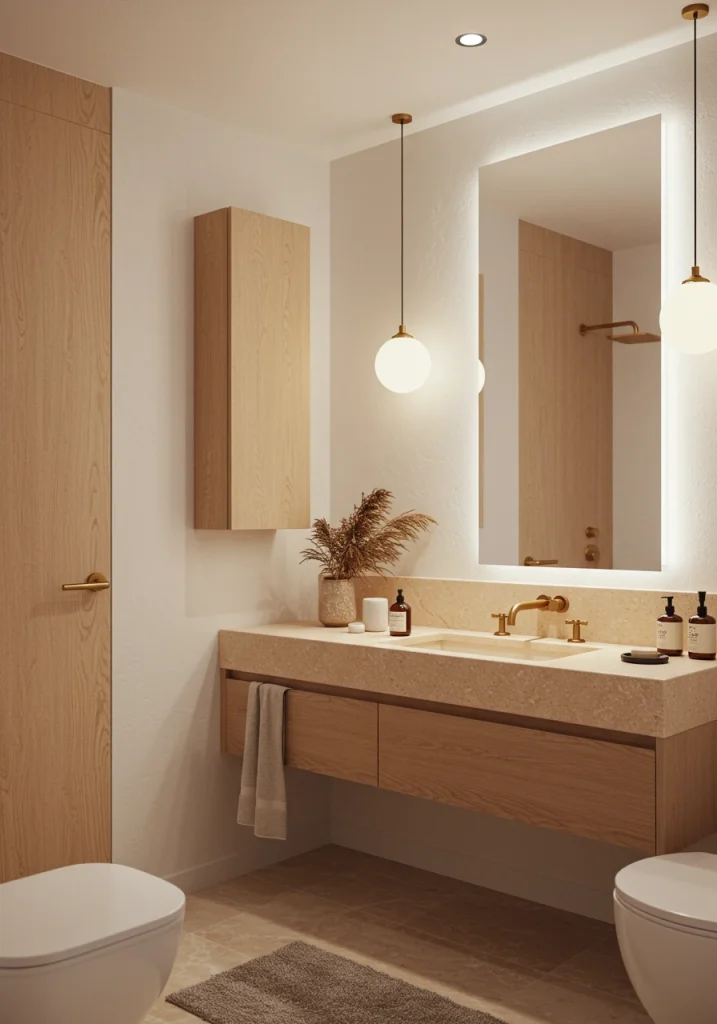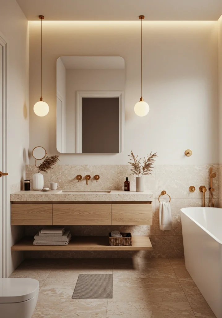 • Balance with Warmth: A natural wood vanity, warm brass fixtures, and soft, warm lighting are essential to keep the space from feeling cold.