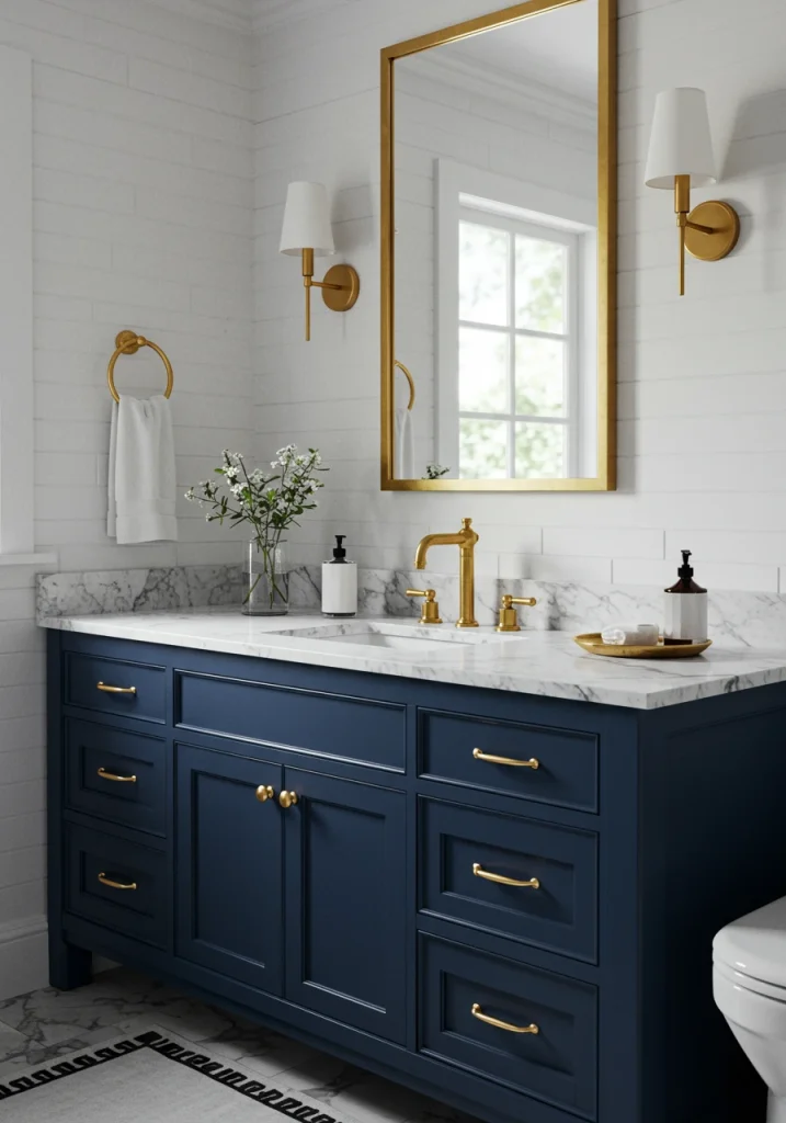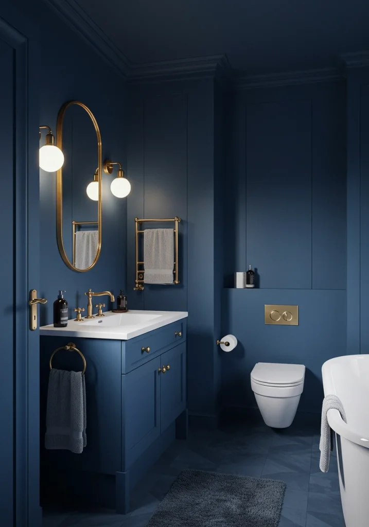 For a look that is classic, dramatic, and sophisticated, a deep, inky navy blue is a stunning and timeless choice for a bathroom. Navy blue is a bold color, but it also functions as a sophisticated neutral. It’s a color that is both grounding and deeply elegant, perfect for making a statement in a powder room or creating a rich, moody master bathroom.