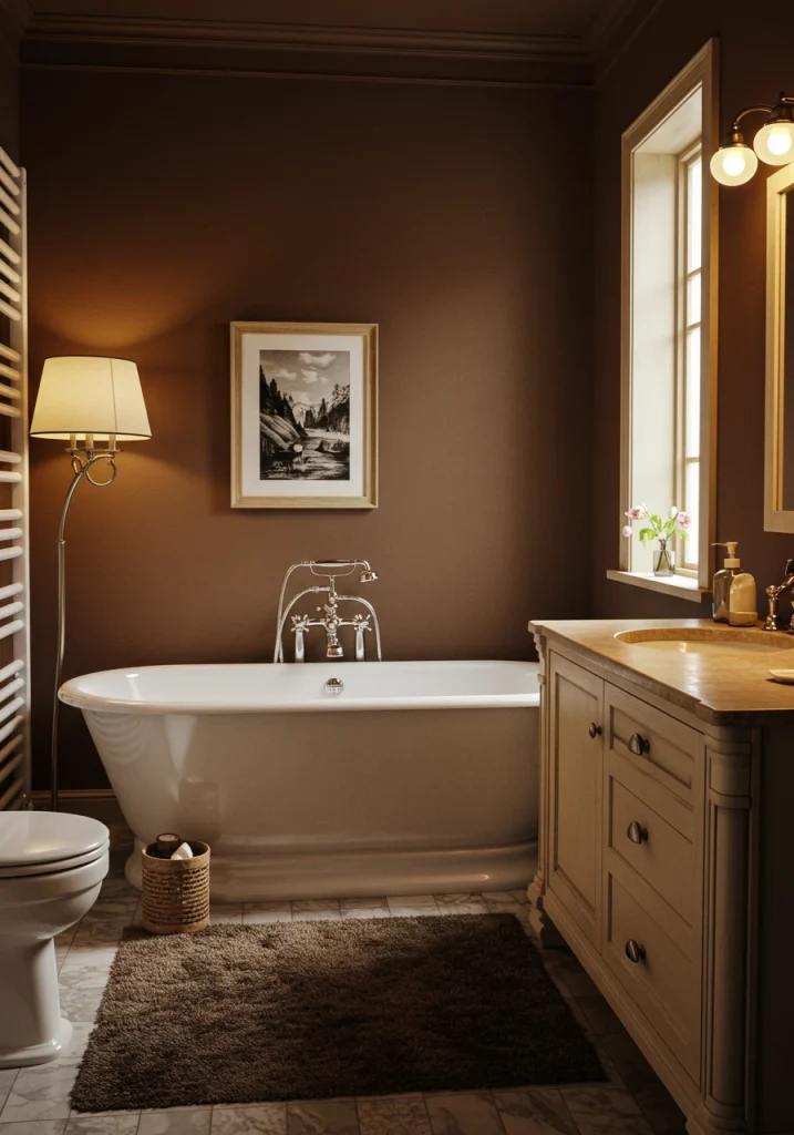 Deep, rich, chocolate brown is making a huge comeback in interior design, and it is a fantastic color for creating a warm, cozy, and luxurious bathroom. A rich, brown wall color can create an incredibly warm, enveloping, and cocoon-like feel that is perfect for a powder room or a spa-like master bath. It’s a color that is both sophisticated and deeply comforting.