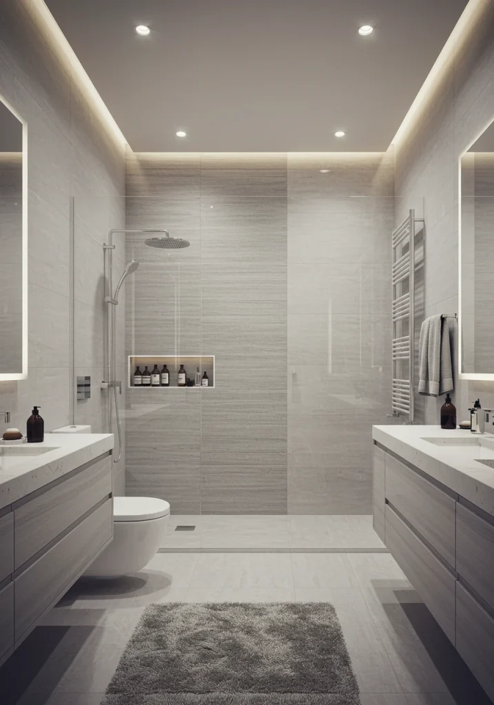 For a look that is modern, sophisticated, and incredibly serene, a monochromatic scheme of layered, light grays is a beautiful choice for a bathroom. As seen in your reference images, this tonal approach relies on the subtle variations between different shades of light and medium gray, and a rich mix of textures, to create interest. The result is a bathroom that feels incredibly calm, cohesive, and has a very high-end, spa-like feel.