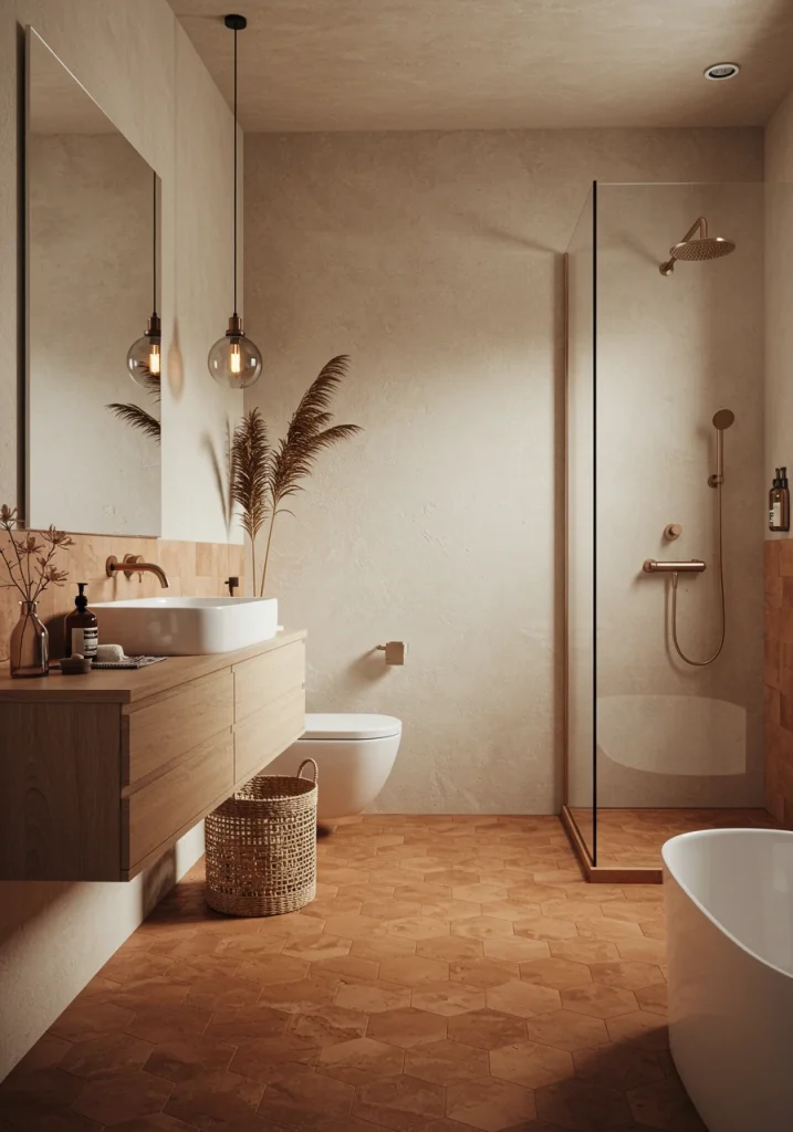To bring a huge dose of earthy warmth and a touch of global, bohemian charm to your bathroom, a color scheme built around a warm, baked terracotta is a stunning choice. Terracotta, with its rich, reddish-brown, clay-like tones, is an ancient and deeply grounding color. It can make a bathroom feel incredibly warm, inviting, and connected to the earth.