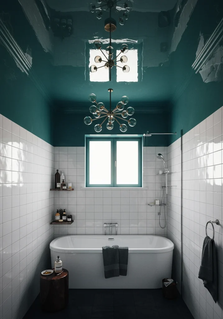 • High-Contrast: A black or a deep charcoal gray ceiling in a white-tiled bathroom is a very chic and sophisticated look.