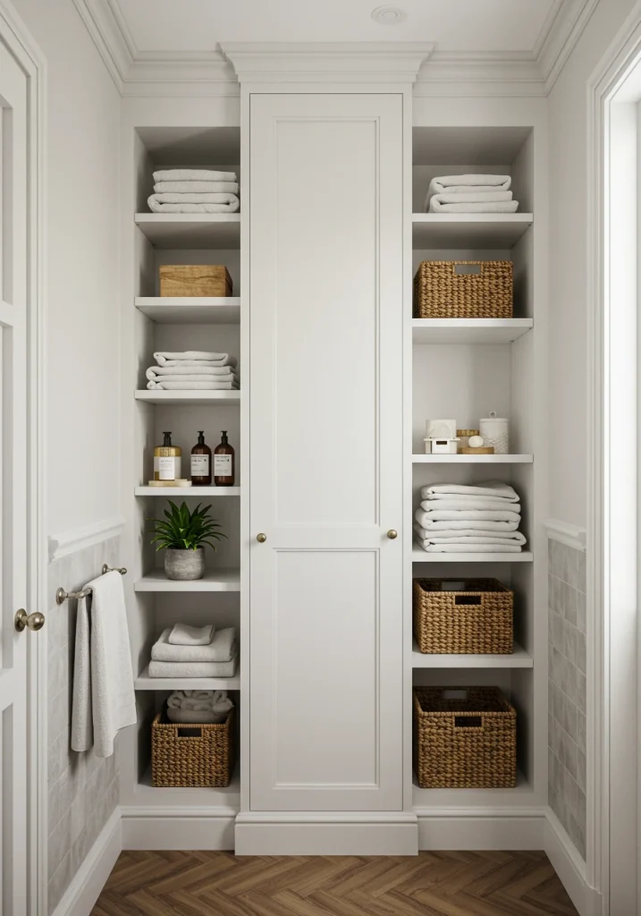 For a look that is truly custom, organized, and luxurious, there is no substitute for floor-to-ceiling, built-in cabinetry. As your reference image of the tall, white cabinet shows, this type of storage can be both incredibly functional and a beautiful, architectural feature. A tall, built-in linen tower can provide a huge amount of hidden storage for towels, toiletries, and cleaning supplies, keeping your bathroom feeling serene and completely clutter-free.