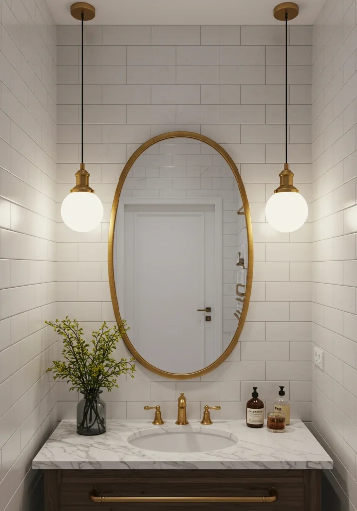 To elevate your bathroom lighting from purely functional to a beautiful, decorative feature, a major trend is to incorporate statement pendant lights or stylish wall sconces. As your reference image with the brass pendants shows, beautiful light fixtures can act as the “jewelry” of the room, adding a huge amount of personality and a custom, high-end feel, just as they would in a living room or a dining room.
