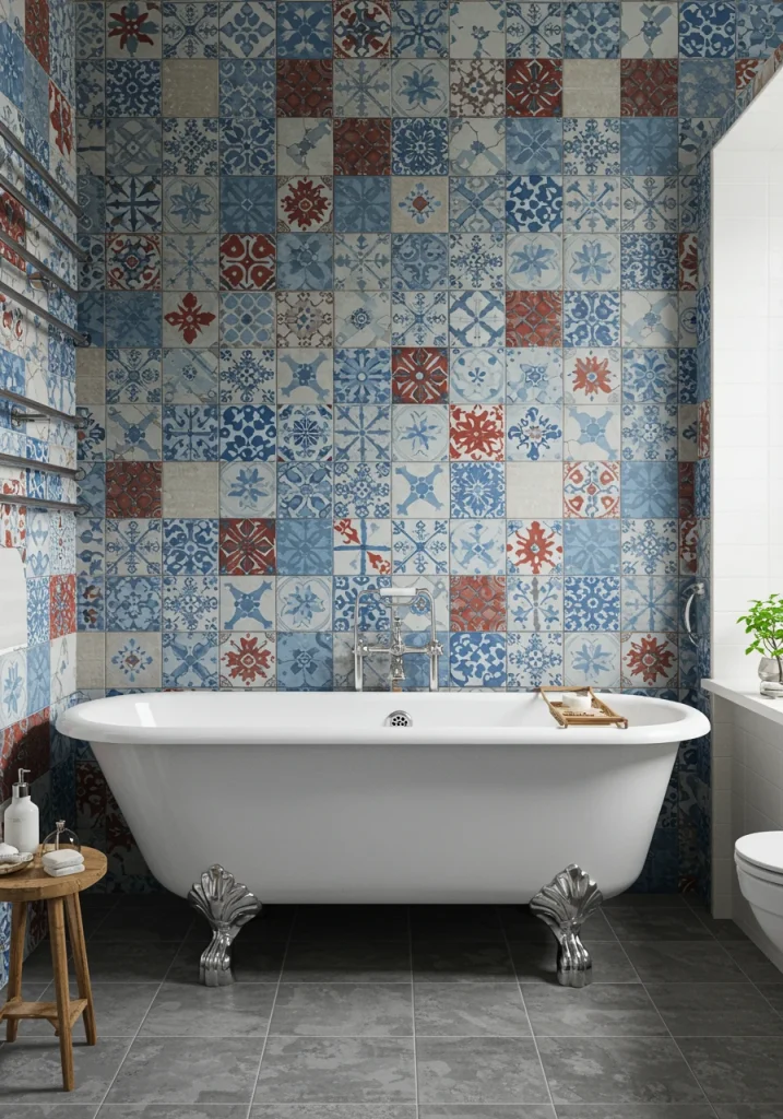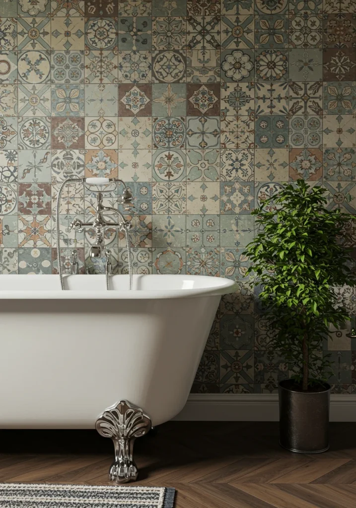 To add a huge dose of personality and custom style to your bathroom, a major trend is the use of a statement patterned tile. As your beautiful, eclectic reference image shows, a bold, patterned tile can be the main “artwork” in the room, creating a stunning focal point. Because a bathroom is often a smaller space, it’s the perfect place to be a bit brave and experiment with a pattern.